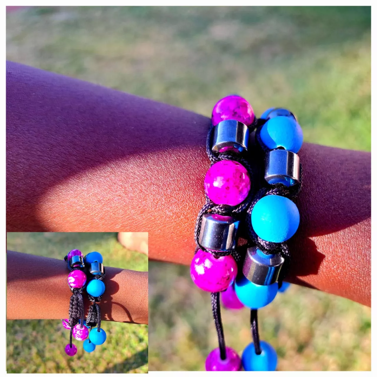 Do you like bright colors and fun shapes? Then you will love this beaded bracelet that looks like a rainbow on your wrist! This bracelet is made with shiny glass beads that are woven together with soft cotton thread. The beads are different sizes and shapes, so you can feel them with your fingers. The bracelet has a leather cord that you can pull to make it fit your wrist. This bracelet is a cool way to show off your personality and style. You can wear it with any outfit or share it with your friends. This bracelet is perfect gifts for kids or anyone who loves colorful bracelets.
